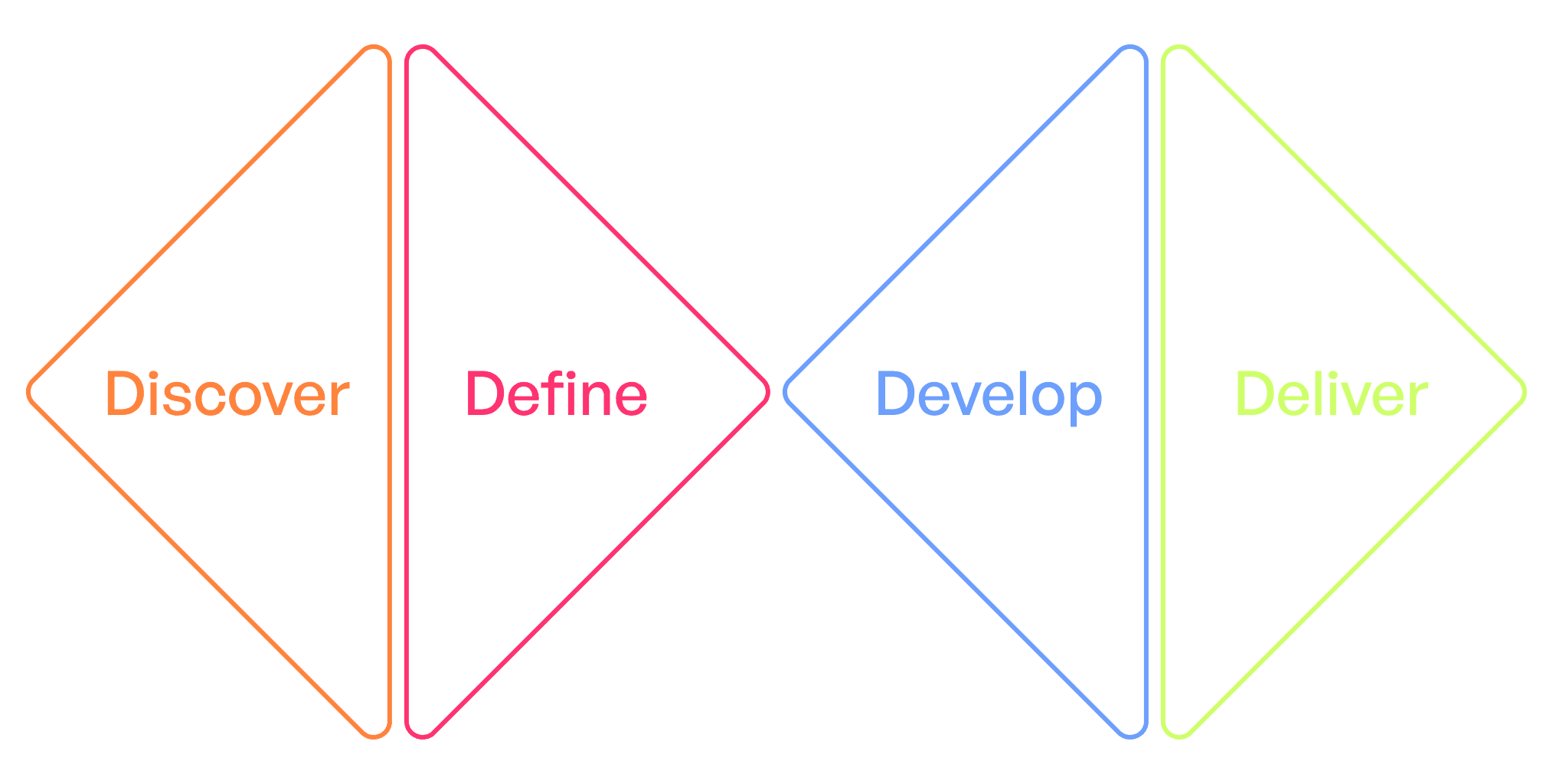 For those unfamiliar with the Double Diamond, it’s a visual representation of the process designers use to create successful solutions. This model is divided into four phases, grouped into two diamonds, hence the name. The DD model emphasizes the importance of exploring a wide range of ideas before narrowing down to the best solution, ensuring that the final design is both innovative and aligned with user needs.